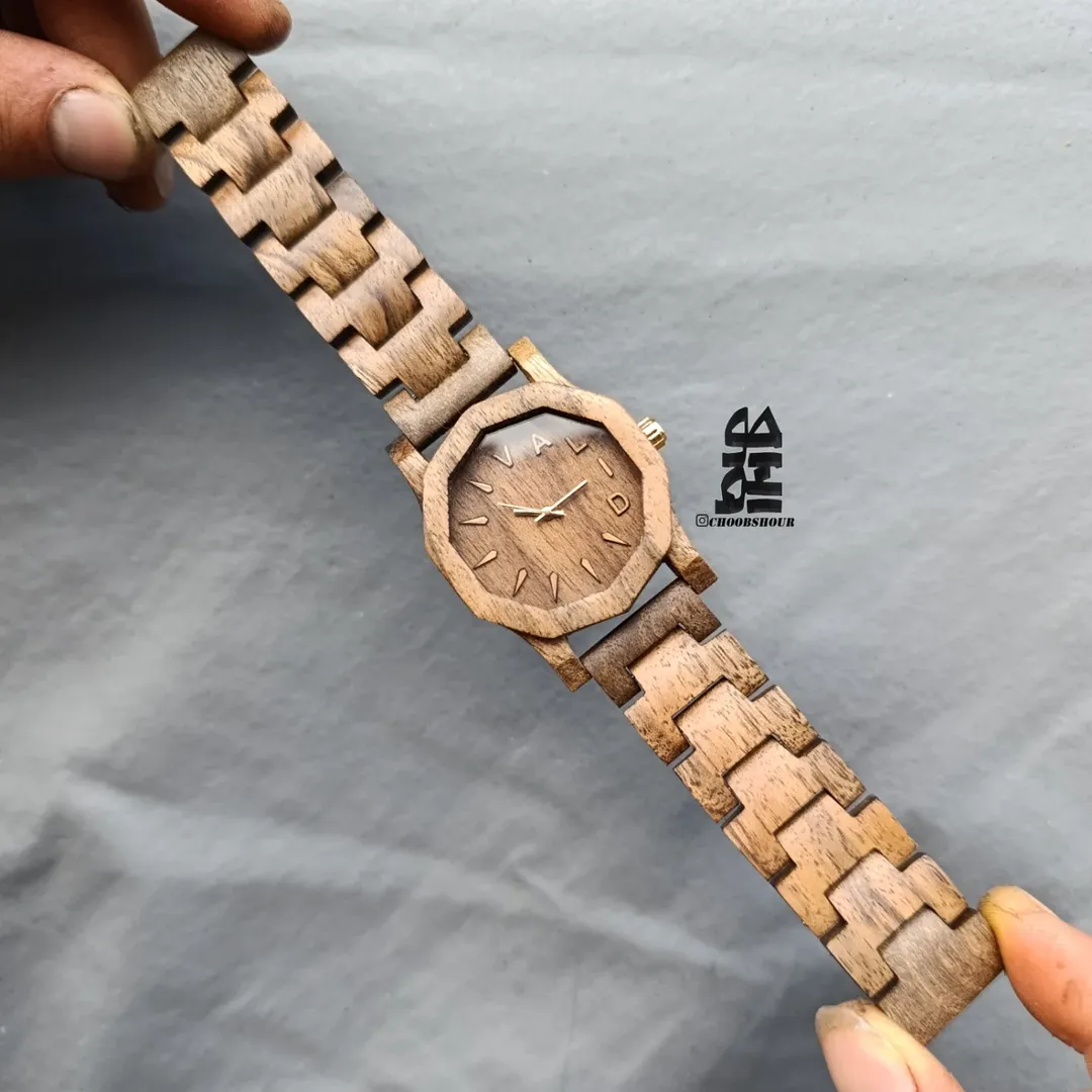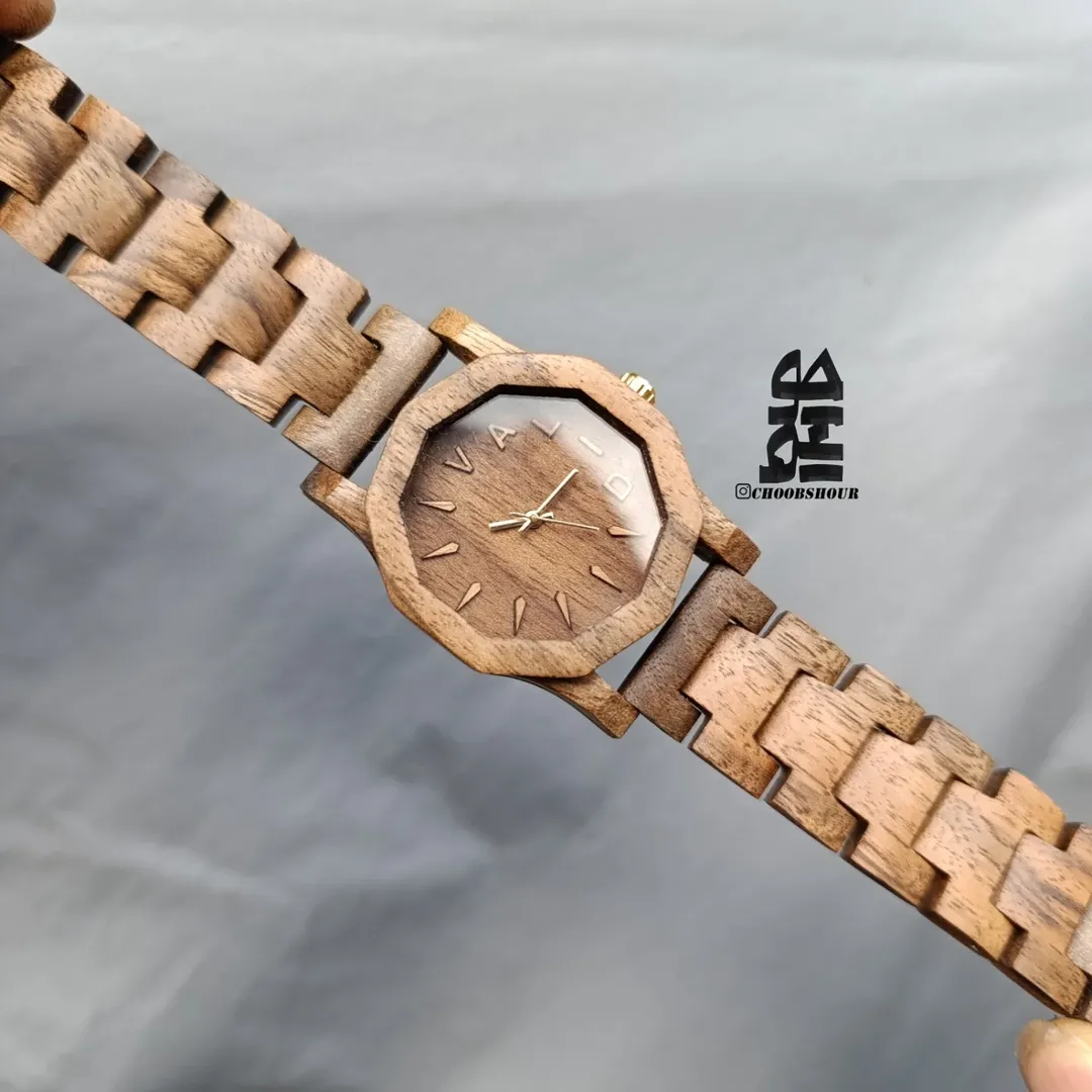 ساعت مچی بند چوبی طرح ۱۰ ضلعی درج حروف اسم به دلخواه شما مدل ده ضلعی بند مدل تانک موتور ژاپنی میوتا