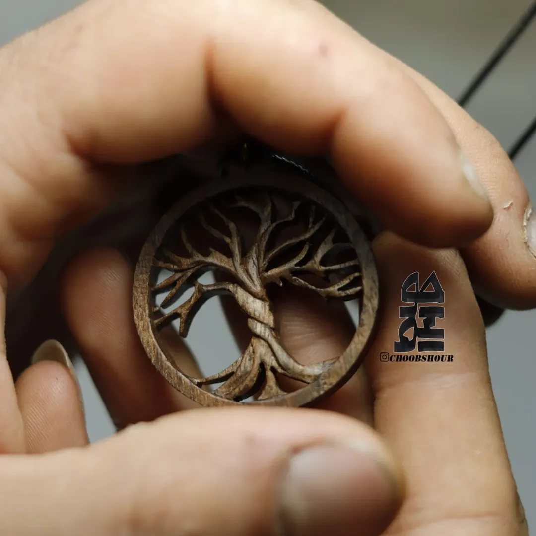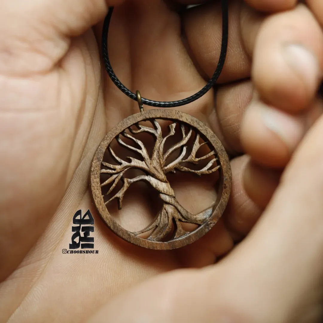 گردنبند زندگی از چوب گردو برند چوبشور با جعبه خاص زیورالات به همراه بند آویز چرمی