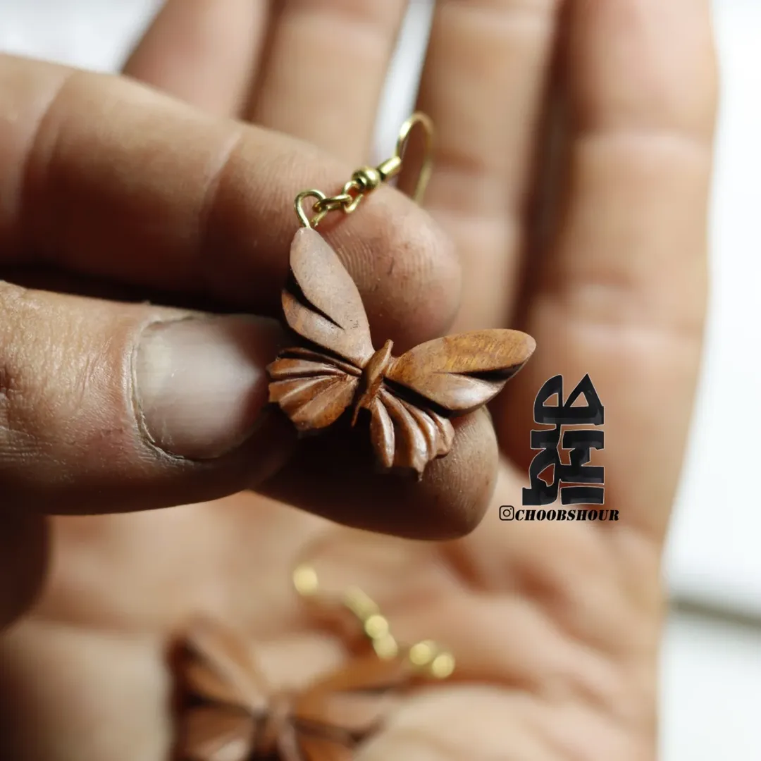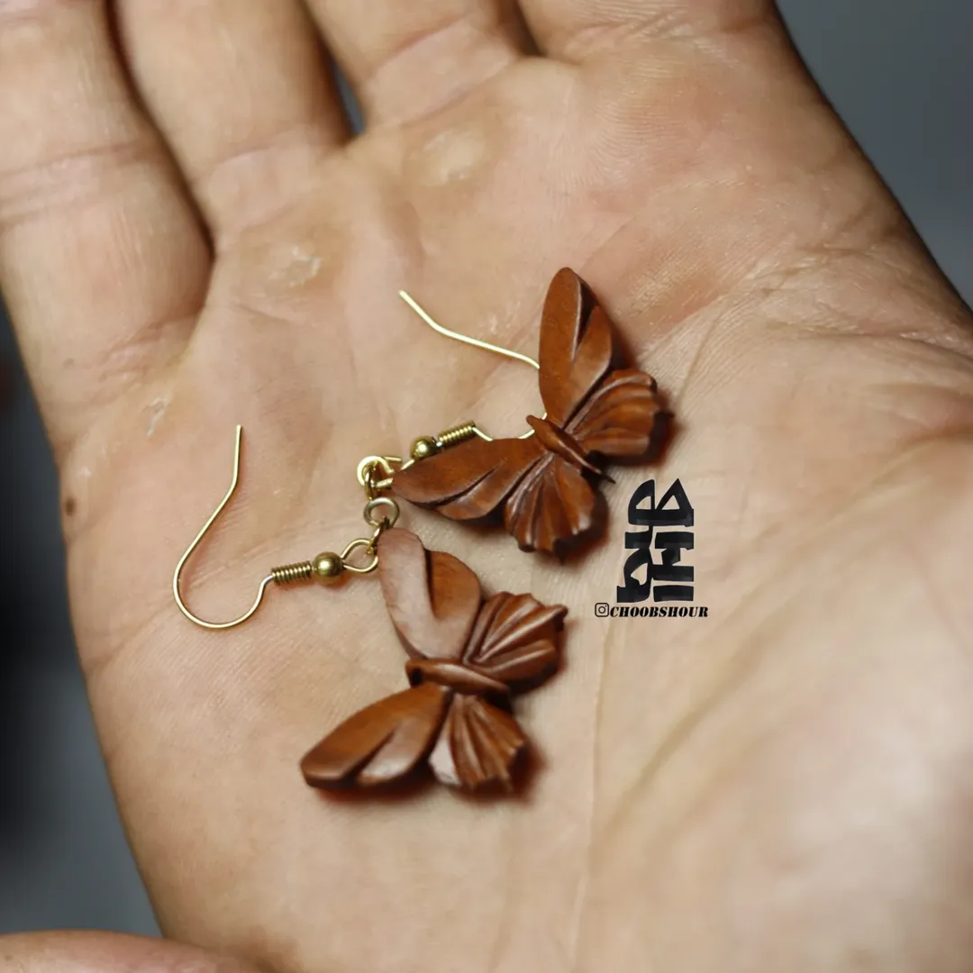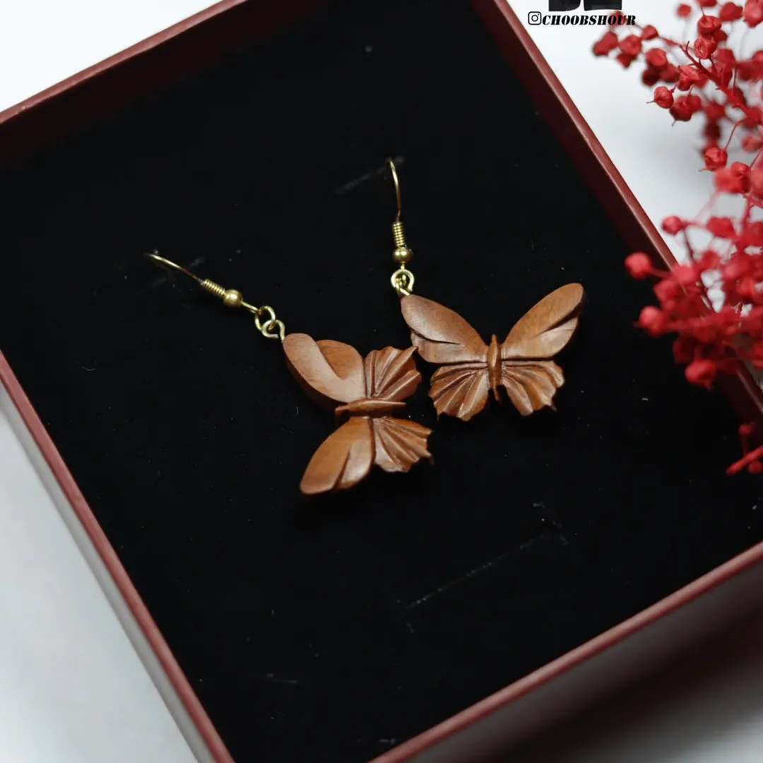گوشواره پروانه از چوب عناب سرخ در سایز 2.5 سانتی به همراه آویز گوش طلایی با محفظه مقوایی شیک