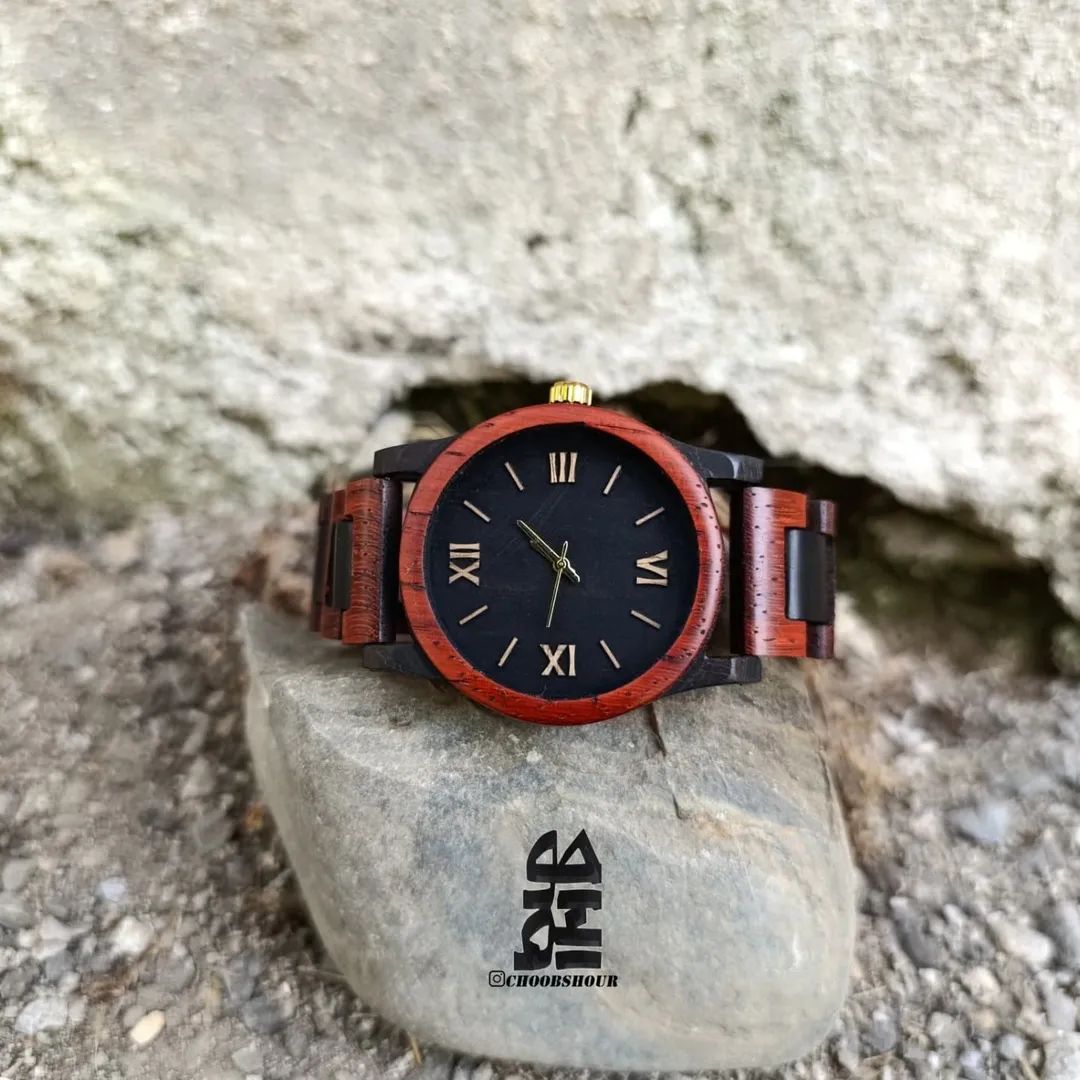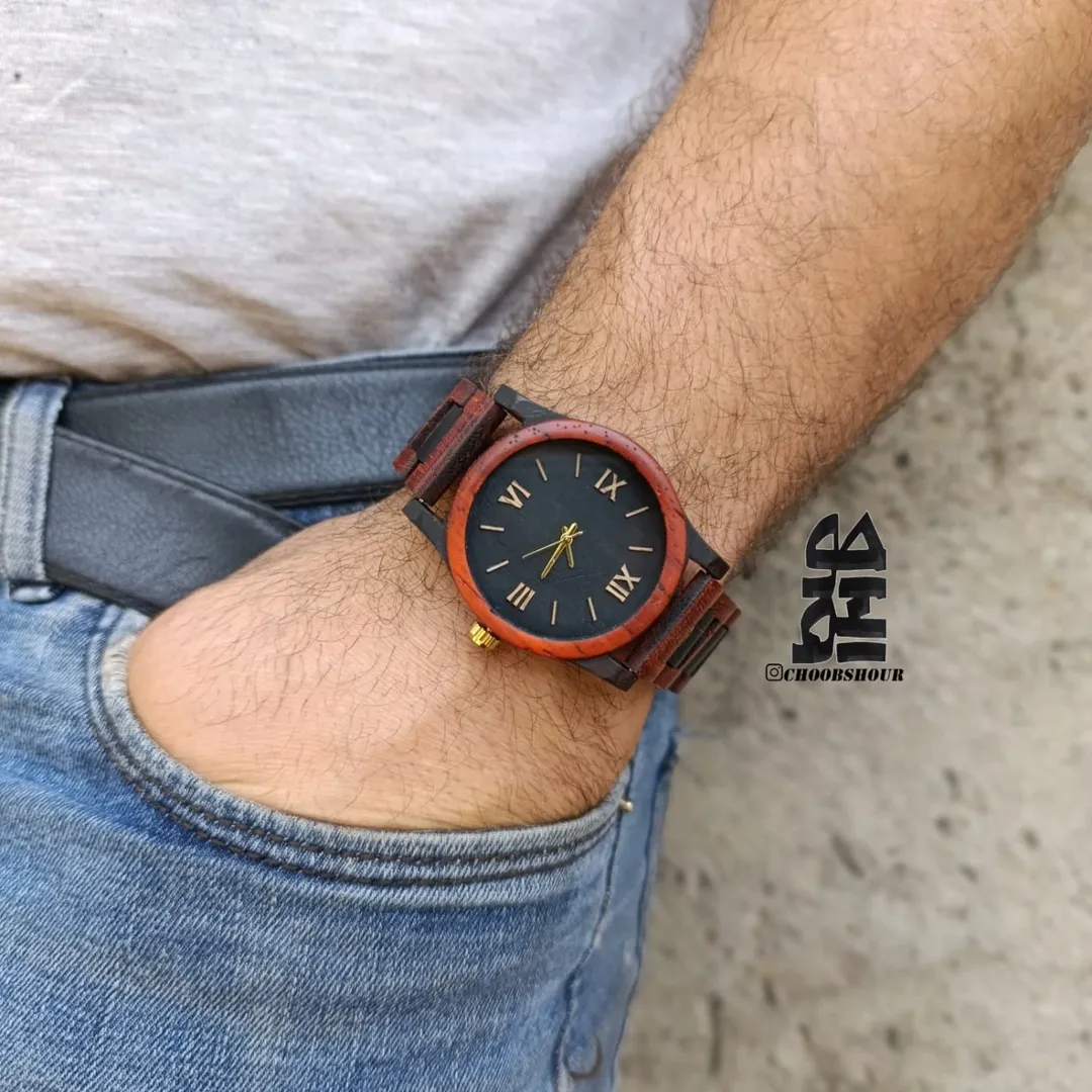 ساعت مچی مشکی قرمز مدل دنور از چوب آبنوس و رز برزیلی در سایز مردانه با موتور ژاپنی